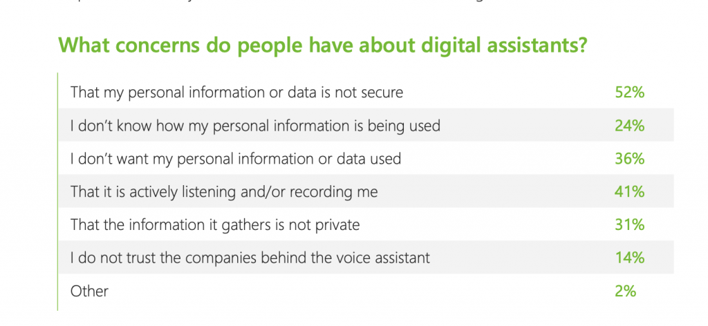A research mentioned in TechCrunch identifies what people are concerned about as the popularity of voice assistants increase. More than half, 52% of people believe that their information is not secure while 41% said they are being actively listened. Privacy concerns are on the rise as people are even admitting to seeing ads tailored to what they were talking about near their voice assistants.